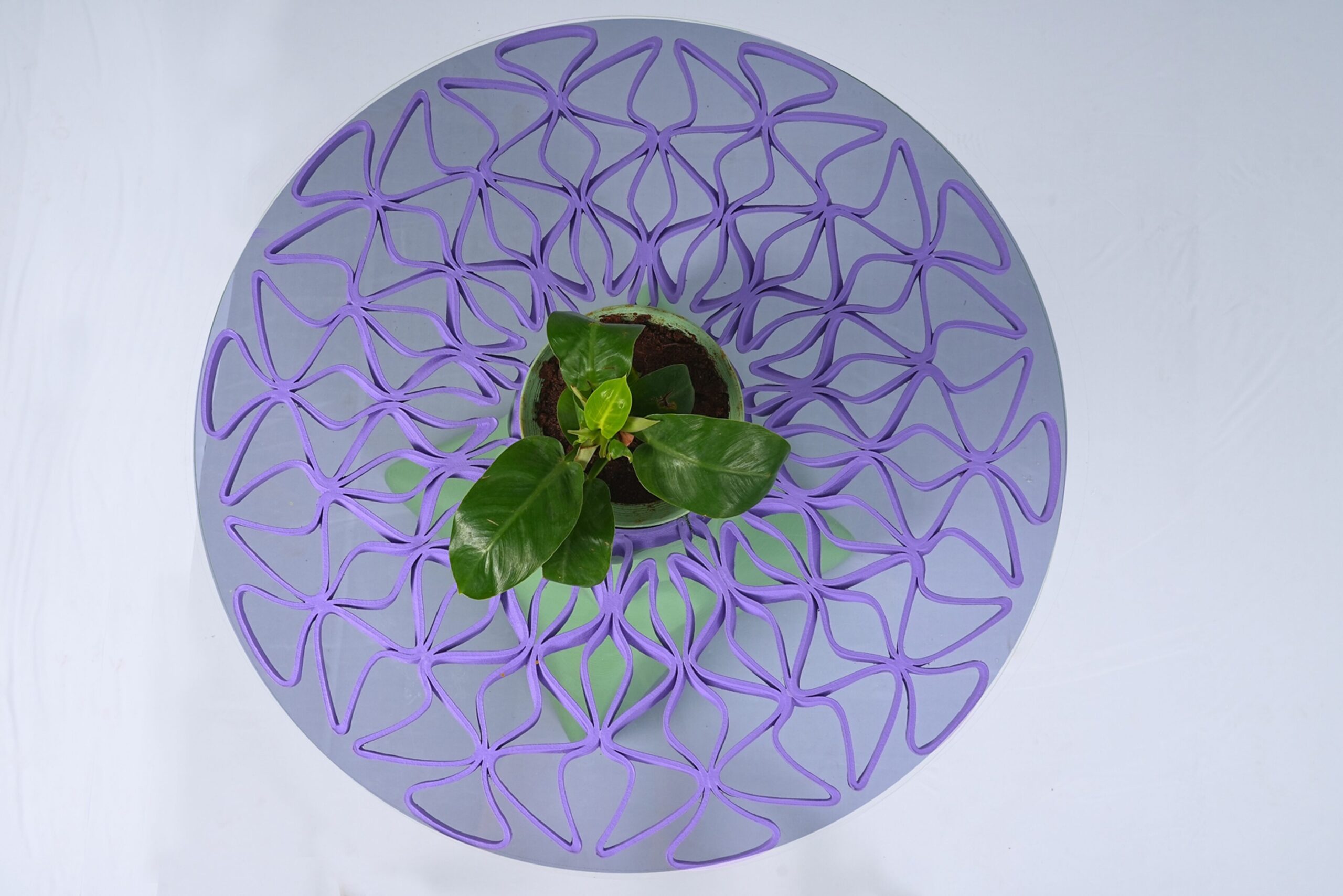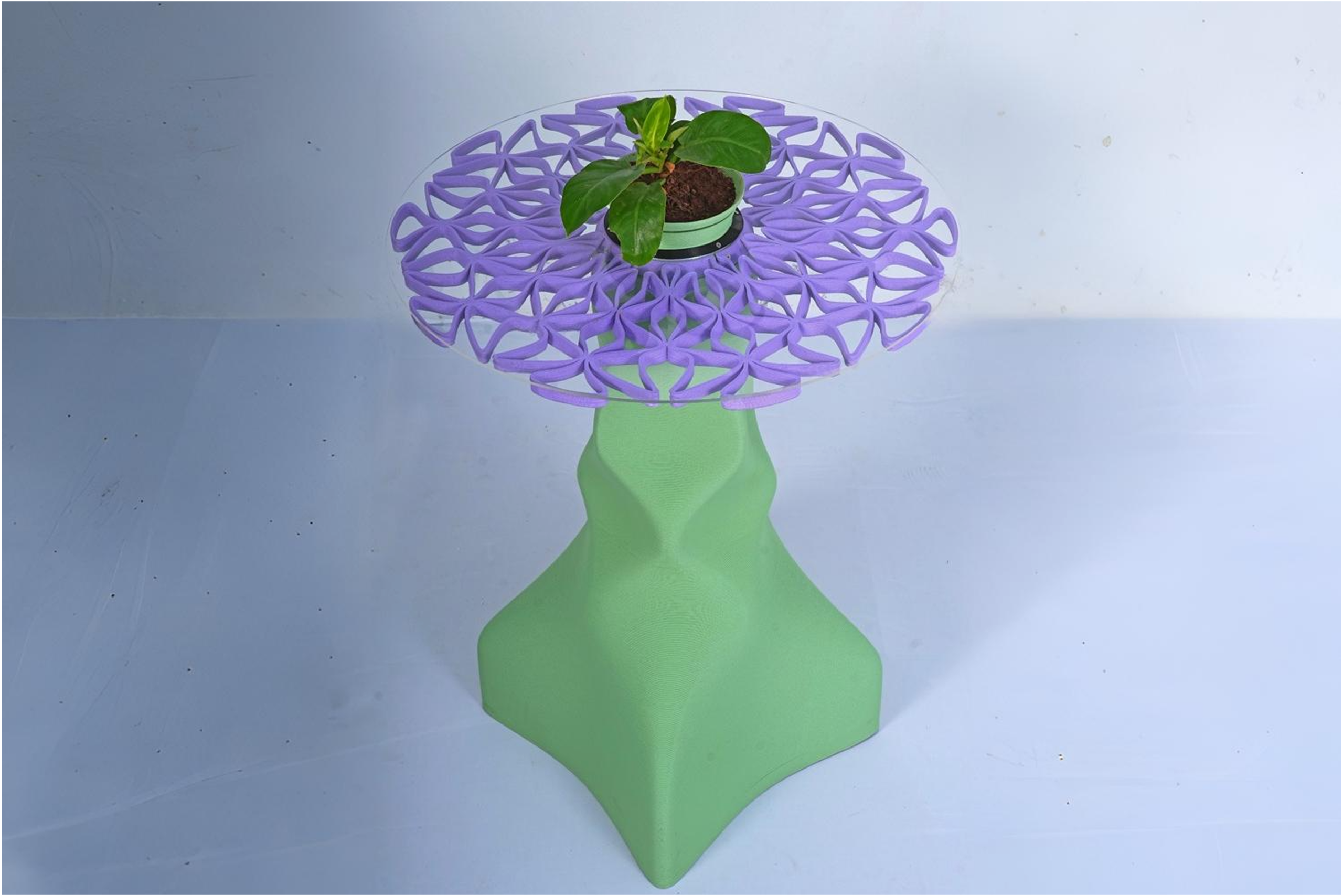 The base evolves from algorithmically controlled geometry, expressing continuous growth-like forms inspired by natural structures. The tabletop incorporates a parametric lattice pattern that creates visual permeability and intricate shadow play, reinforcing the desk’s sculptural and botanical character.